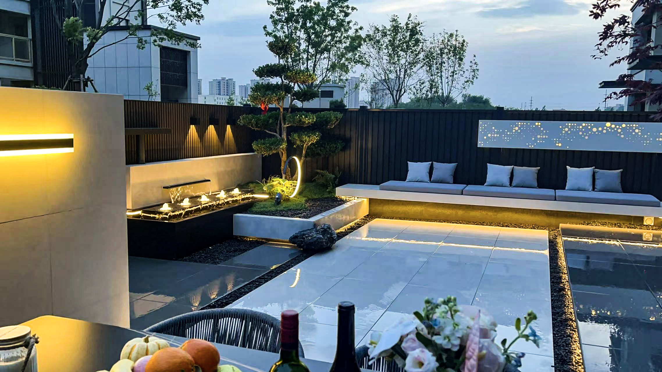 室内出户根据原有高差,因地制宜,设计一个休闲平台,是室内向室外的过渡与延伸,庭院中间采用了现代简洁的奶白色与深灰色相间的石英砖作为大面积的地铺,点缀黑色小卵石,节省成本的同时增加趣味性;对景为低矮景墙、景观跌水结合观赏草搭配,右侧一棵造型黄杨作为主景树,姿态苍劲秀丽,搭配彩虹蕨、大叶吴风草、中华景天等,再辅以黑色小卵石、圆形灯、黑山石等装置,小院绿意随即精致活泛起来,景深通透间更显朴素淡雅,水景后景墙使用朦胧水墨画花纹石英砖作为景墙贴面,结合木色长城板,点缀壁灯,担当夜晚的氛围组,整个水景区四季常绿,富有诗情画意。