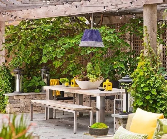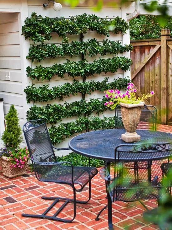 利用高的网格状物来建立天井周边的一个温和边界,这是一个非常不错的方法。如果想为花的成长提供足够大的生长空间,那要选择一个适合的地方,例如在阳光充足的条件下种植葡萄。待葡萄开花之时,迷人的芬芳气味扑向路人,是个不错的选择。