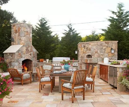 用石头铺设地板,可以让你的庭院缓和、不突兀地过渡到庭院周围的石径——但为什么不设计并建造一个具有一定高度的石凳,为客人提供座位?因为壁炉附近的的矮墙已为客人坐供应了一个即兴的现场座位了。