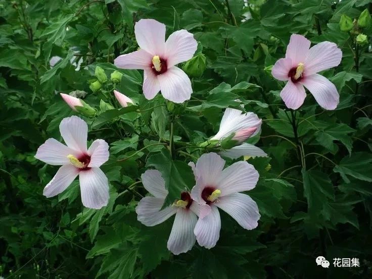 大花秋葵:多年生草本,高1~2m,粗壮,斜出。单叶互生,叶长8~22cm,叶形多变。缘具梳齿,花大,直径28cm,玫瑰红或白色,花期6~9月。