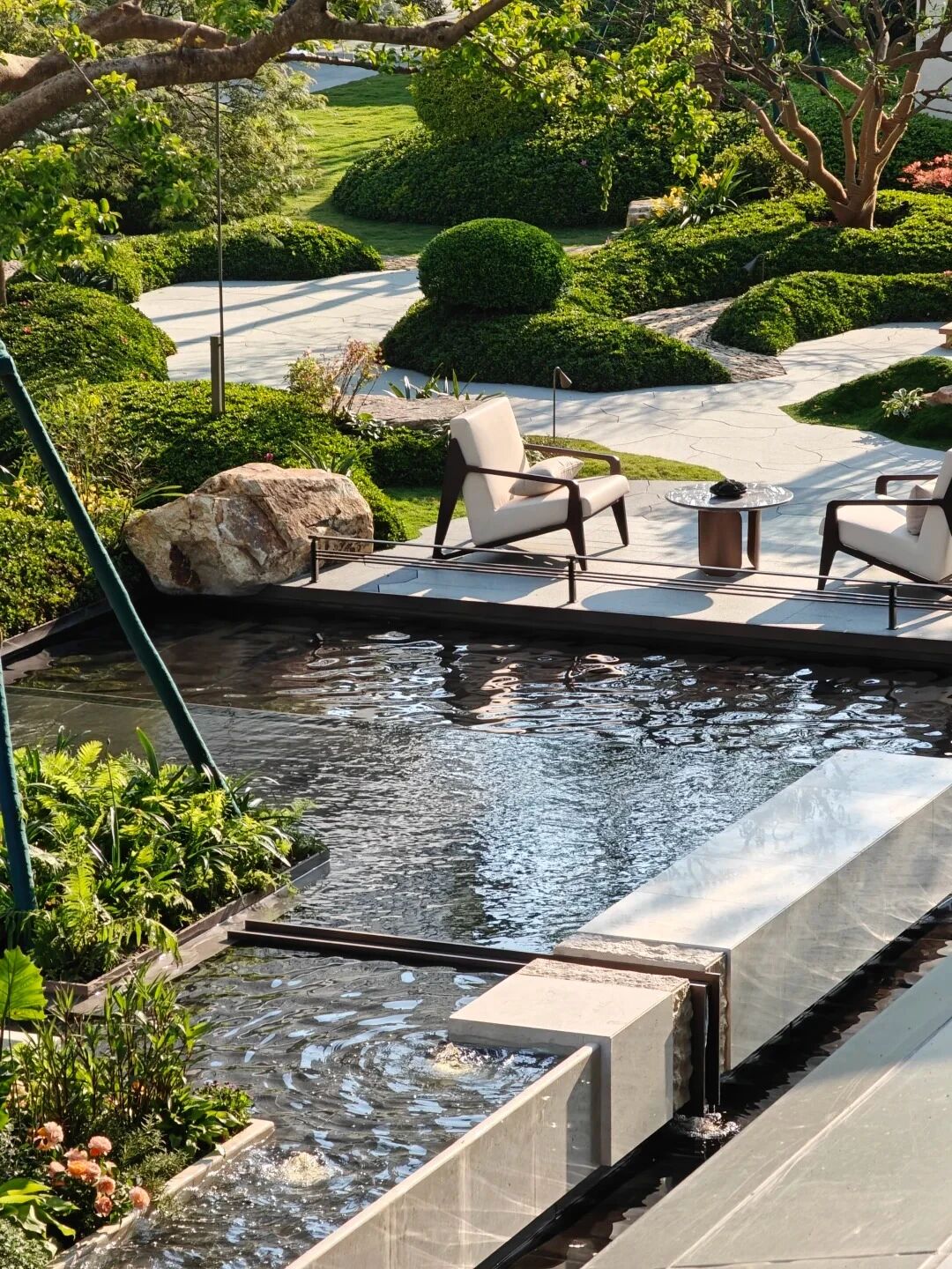 流水的潺潺声、喷泉的飞溅声可以在庭院中创造出独特的听觉体验。这种自然的水声可以起到安抚情绪的作用,掩盖周围的噪音,营造出静谧的氛围。