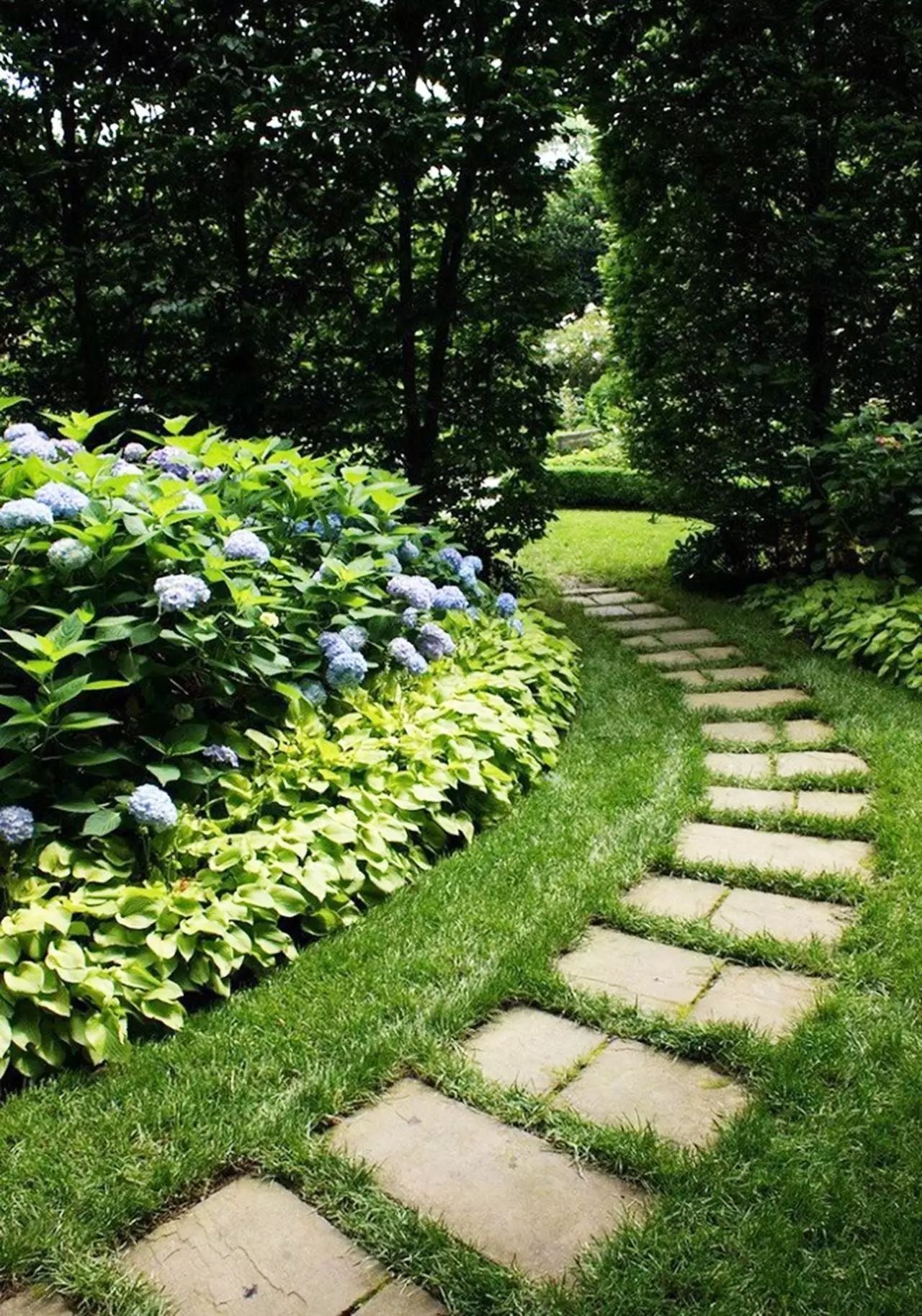 在狭长的空间中布置汀步,与草地很自然的融为一体,使整个空间不至于那么拥挤,而不规则摆放的汀步,又让这条小道富于变化,也能保证草坪植被不被破坏,带给人不一样的自然体验。