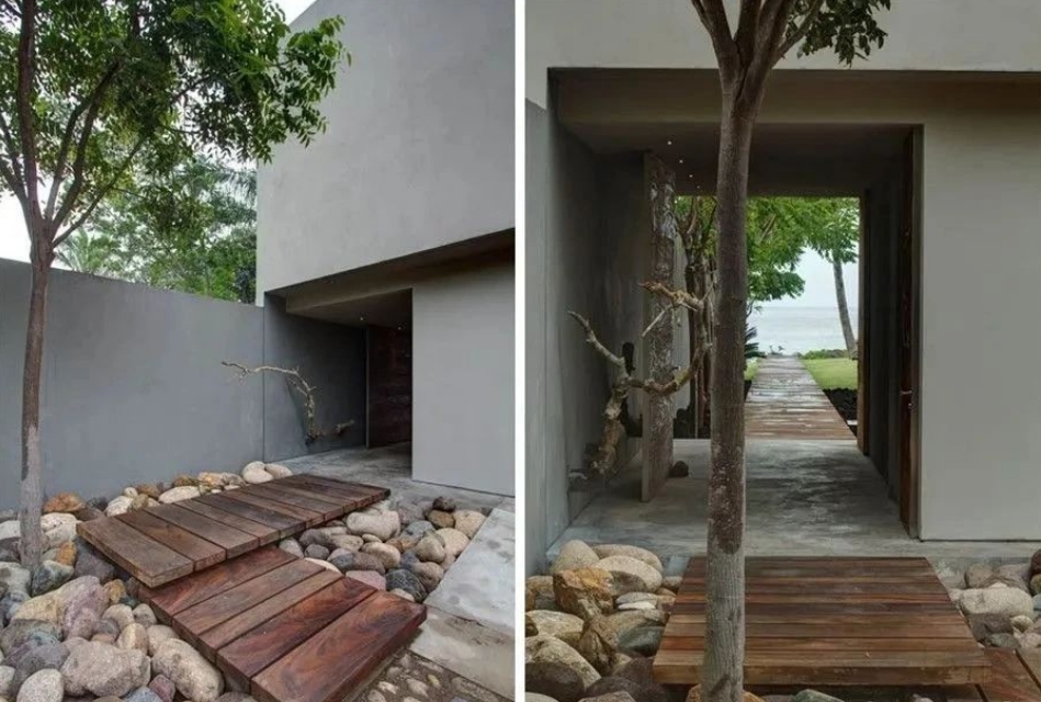 项目位于墨西哥的一处海湾旁,从入口体量开始,一条坚实的木结构连接轴横跨整个建筑,一直延伸到大海,连接所有不同的体量。这条木制通道通过旁边漂浮在火山岩床上的主体体块。