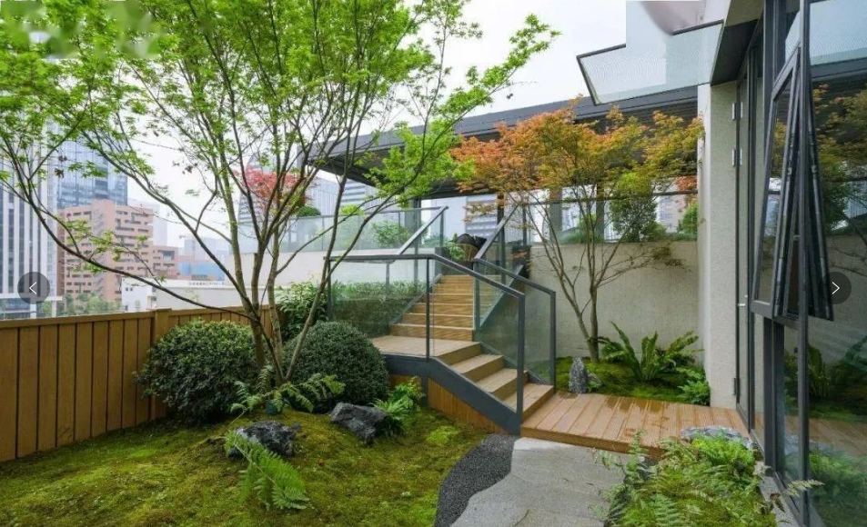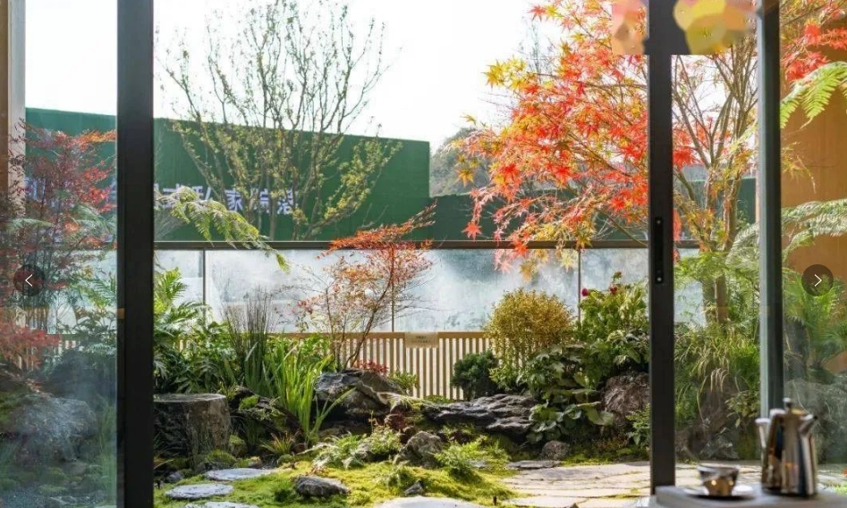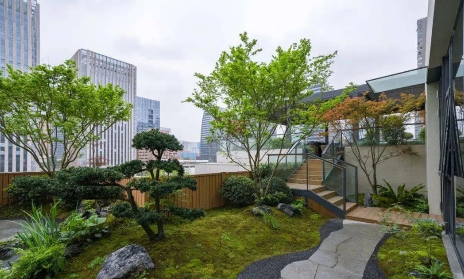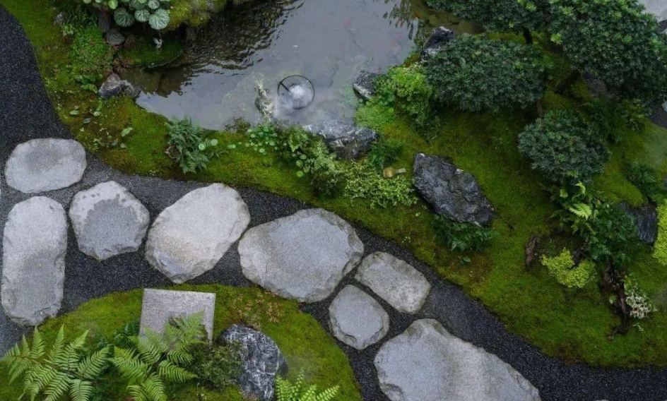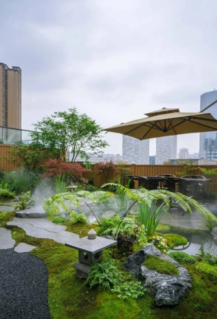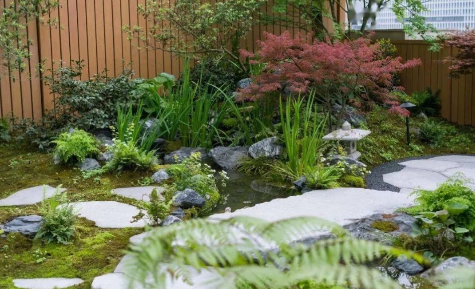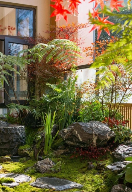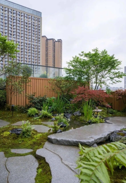 设计采用日式枯山水的意境,展现出自然禅意感,再与现代日式简约的构筑物、景墙及小品结合。植物配置也是以日式庭院造景手法为主,运用蕨类、日本红枫、大吴风草等植物营造出独特的景观。