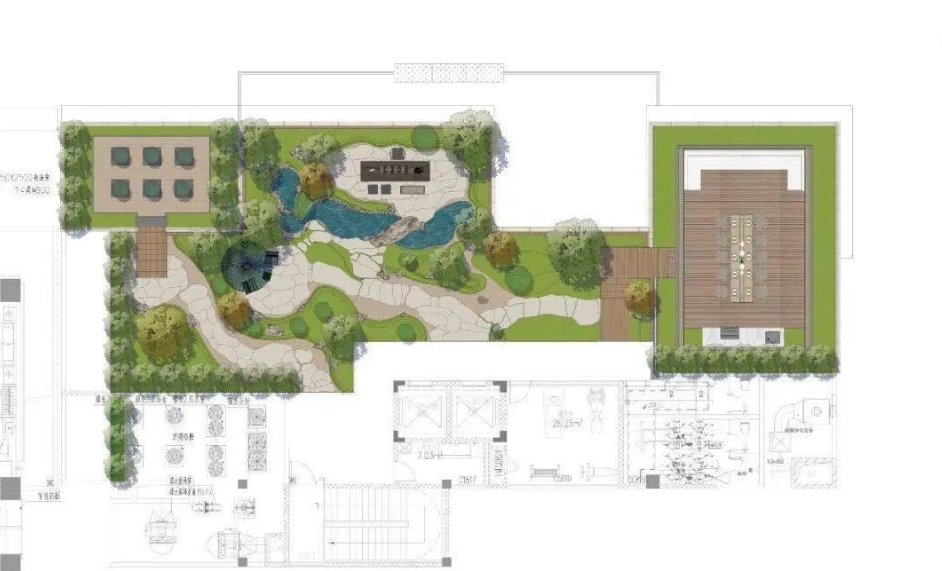 涵麓渡W会所花园大约600㎡,主要从空中花园、归园田居、聚会空间、云阶月地四大主题空间出发,花园风格是禅意盎然的现代日式庭院。青岛庭院设计公司——兰亭景观为您介绍。