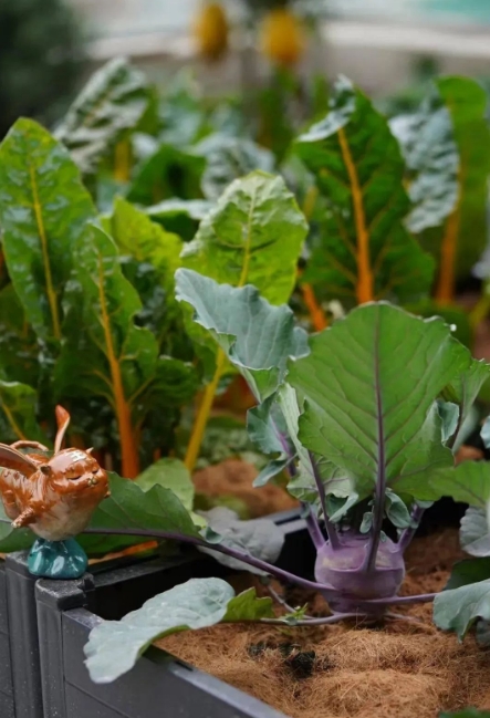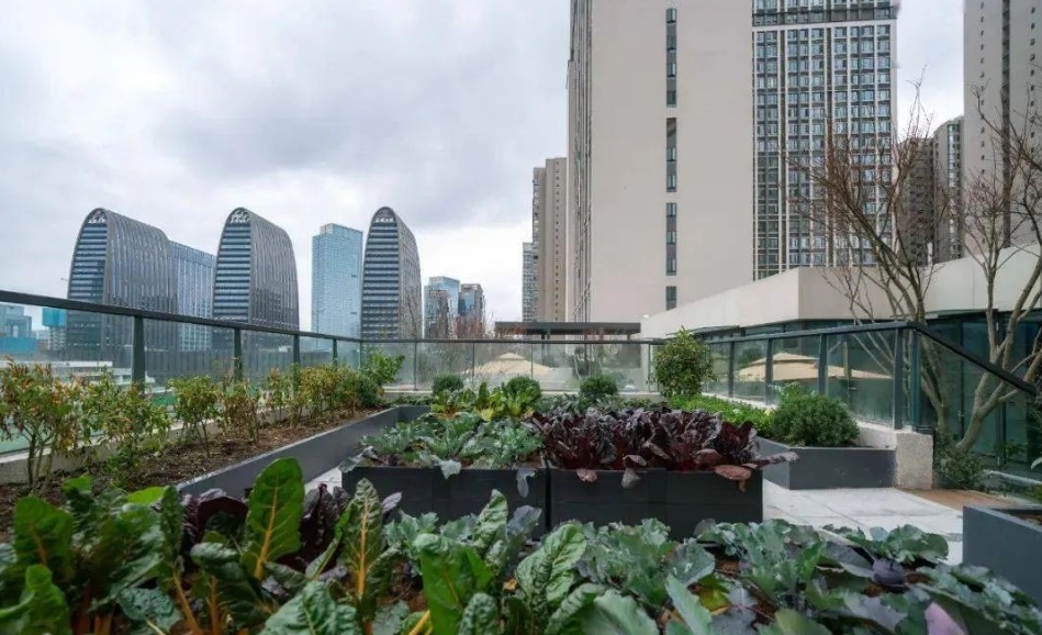 在屋顶花园的一角还设置了一片菜地,在规划好的小花盆中种植香草,大花箱中种蔬菜,又或者在网格架上种植藤本蔬果,在装饰庭院的同时也让人体验了一把田园农耕生活。
