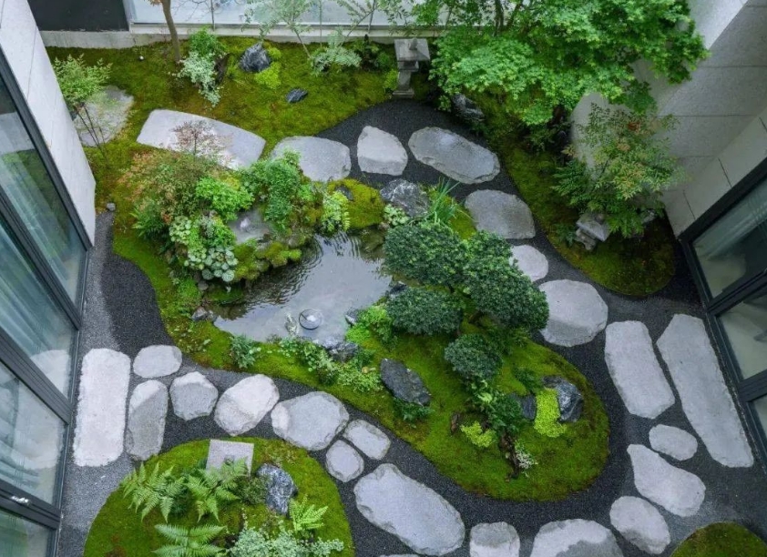 在涵麓渡W会所花园的三层,设计了一座秘密庭院,整体以苔藓植物搭配砾石汀步来体现,延续着现代禅意的空间氛围。