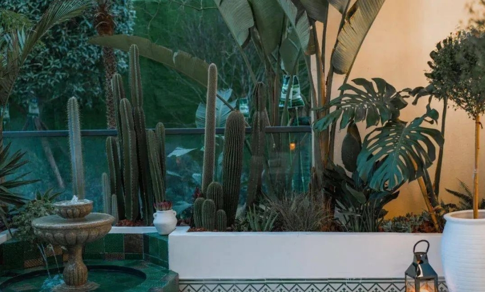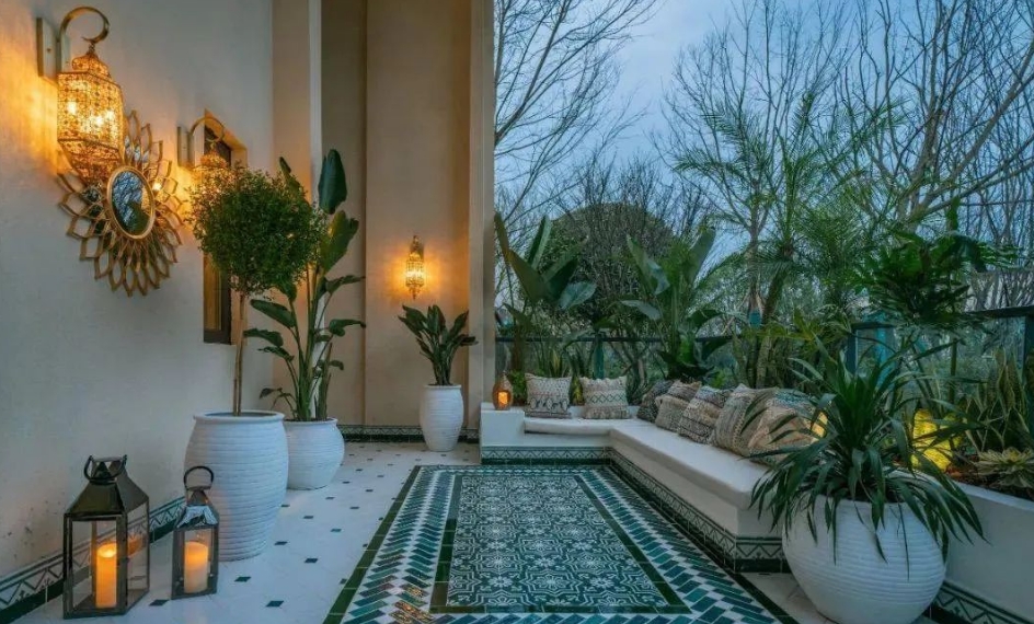 通过阳台地砖、照明灯具、沙发等硬软装全面打造一款摩洛哥风格的花园,外围的植物采用耐旱的旱生植物与部分室内风格植物结合,创造摩洛哥的异域风情,足不出户可以享受在国外度假的感觉。