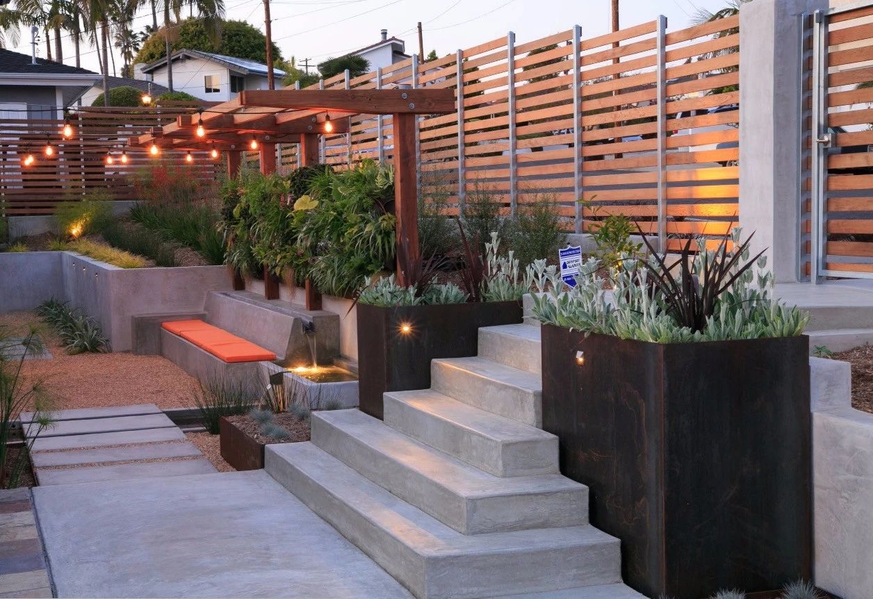 廊架不仅可搭配植物圈围出舒适的景观性休闲空间,也可用于功能区域的划分和装饰如停车廊架、烧烤台廊架等。自然风格的小庭院,也可考虑搭设拱门花架,或三角花架,将直角空间有效利用,既能营造景观休闲空间,又能节约占地。