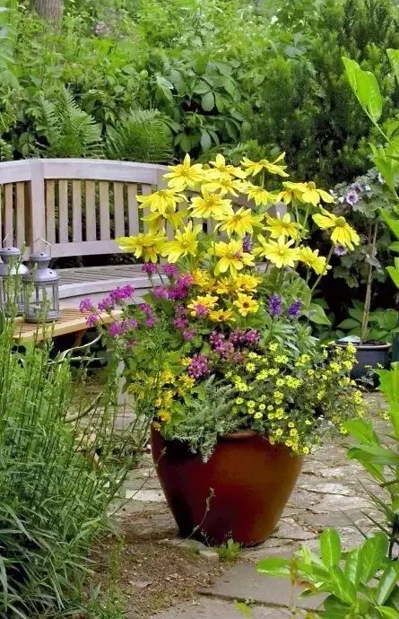 容器组合中的植物搭配要突出主题(如前所述主次分明),颜色不宜太多,一般来讲不宜超过3种色调,否则太过于花哨。如果某种色调过重,还应加以适当稀释。如下图主色调是黄色(金光菊Rudbekia hirta,蛇目菊Sanvitalia speciosa和皇帝菊melampodium), 由于金光菊很高大,另两种黄花过于矮小,中间就需加些冷色调紫色( 蓝花鼠尾草Salvia farinacea,细叶美女樱Verbena speciosa和大花夏枯草Prunella grandiflora)过渡中和,否则整盆花色太凝重,结构略为死板。