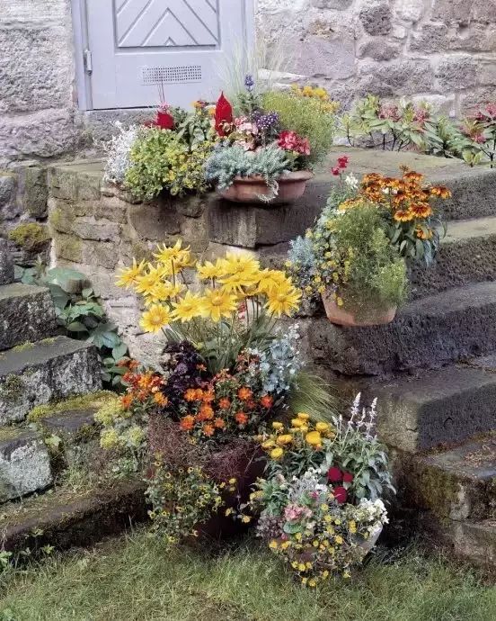 图中门廊组合容器的摆放也颇有讲究:种有黄色金光菊的高大容器摆在正中地势低的地方,而种有四季海(Begoniasemerplorens)和羽状鸡冠的矮盆摆在最高位,余下则环绕着金光菊,像不像五口之家在门口晒太阳?