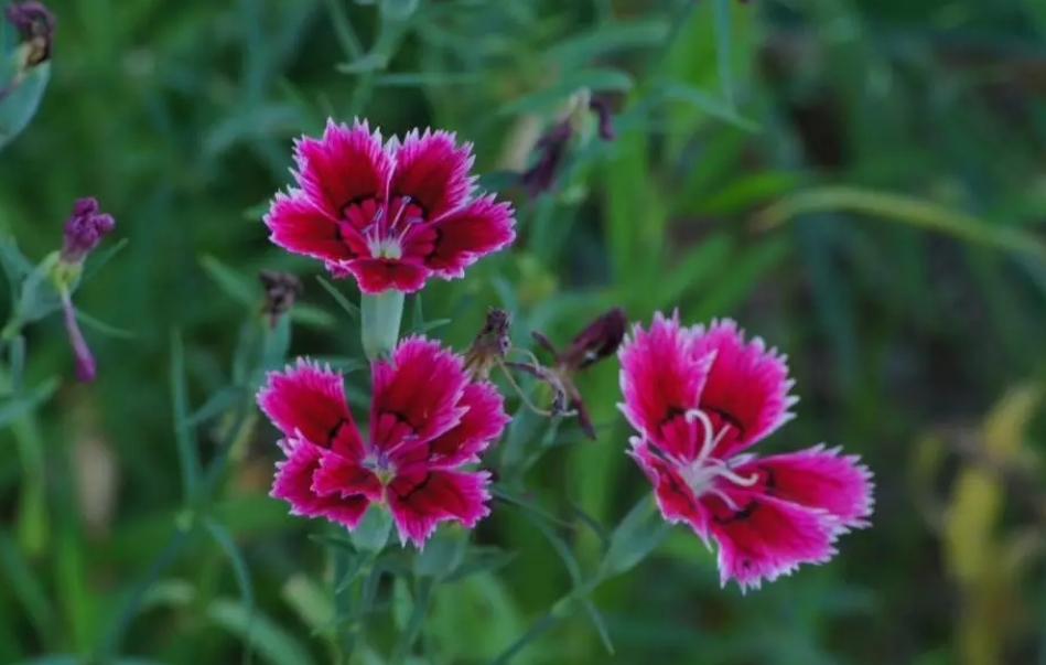 石竹是最典型的切花镶边植物,色彩缤纷,花期较长。植物花期:4~10月,集中在4~5月园林应用:花色有白、粉、红、粉红、大红、紫、黄、蓝等,变化多。园林中主要用于花坛、花境、花台和盆栽,也可用于岩石园和草坪边缘镶边,大面积成片栽植时可作地被材料。