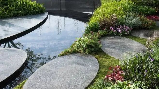 现代汀步的形式,已经不止局限于传统的自然形态了,各种形式和材质都有了更多的选择。有方形的、圆形亦或是椭圆形的;有石材、木材和金属等。