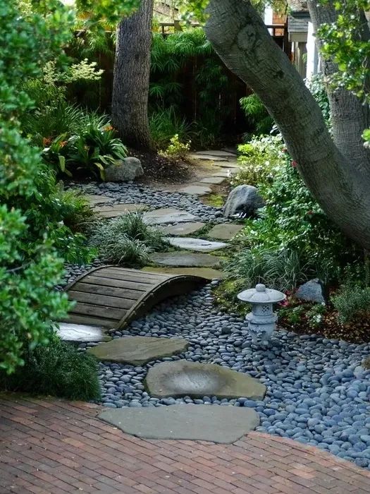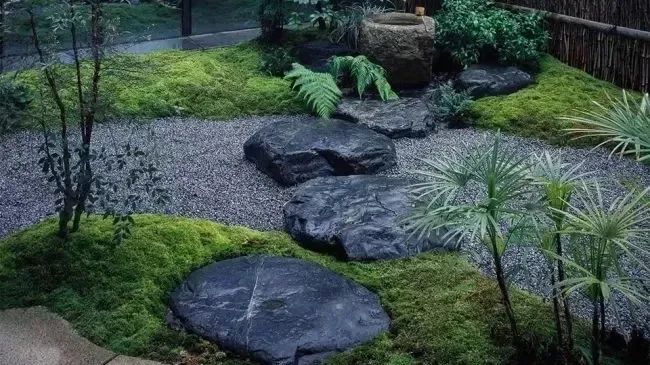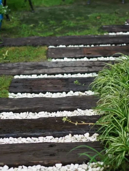 与沙砾结合的汀步,在形式上构成的变化和对比虽然不尽相同,但在色彩上却能很好地做到统一化。恍惚间,还有一种山水交融之感。使整个空间的搭配和谐自然。