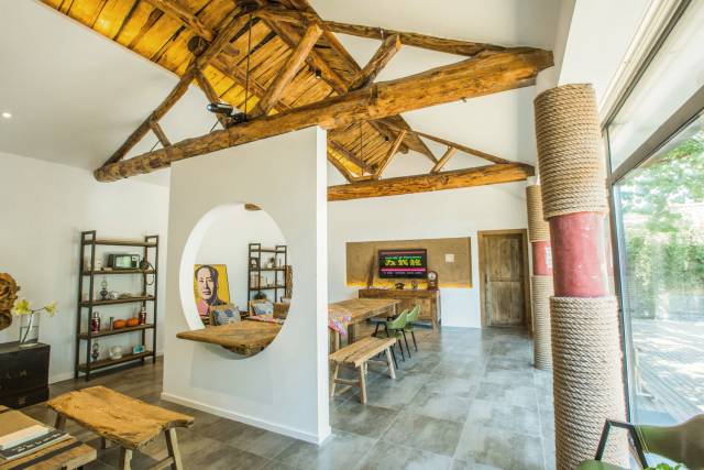 房间的顶部刻意保留了传统的木梁结构,与现代简约的大白墙混搭起来,碰撞出一种亦古亦今的美感。