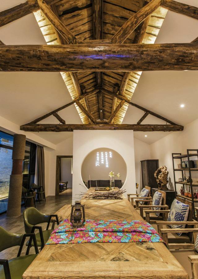 “从前慢”的主题,几乎渗透在院中的每个角落。就像这面老房中的圆形镂空墙,一头连接着古朴雅致的茶室,另一头连接着墙上写满诗的客厅。