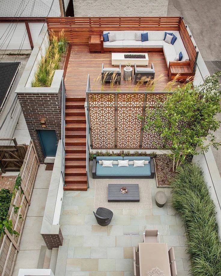 那如何进行露台区域防风呢?可以利用铁艺、木栅栏、木条的屏风,还有钢梯、搭建廊架形成天然屏障,从而相互防御。