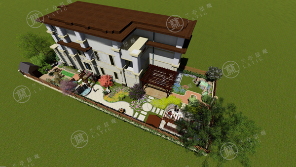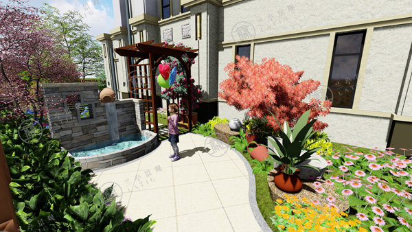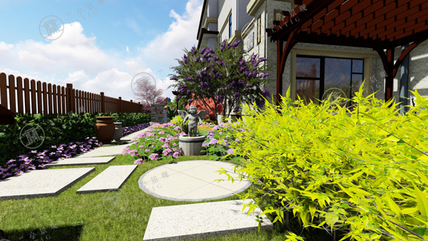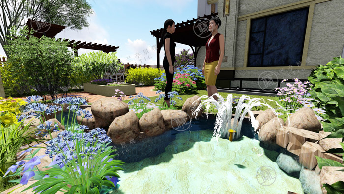 2.东方具有木气,喜木喜水,宜布置水局。设计师在庭院的东南角布置一处自然水景,与花草结合,富有生气。