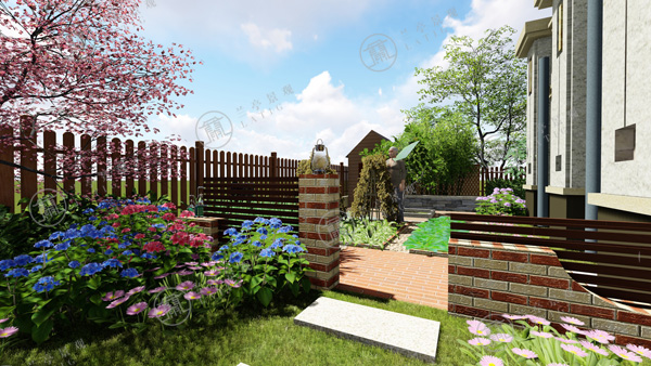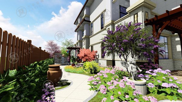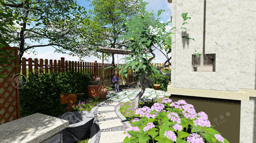 1.整个青岛庭院设计分为入口水景、廊下休闲、花径小路、田园菜地和秋千花园几大部分。进门处布置树池,以解决庭院门与建筑门相冲的问题。