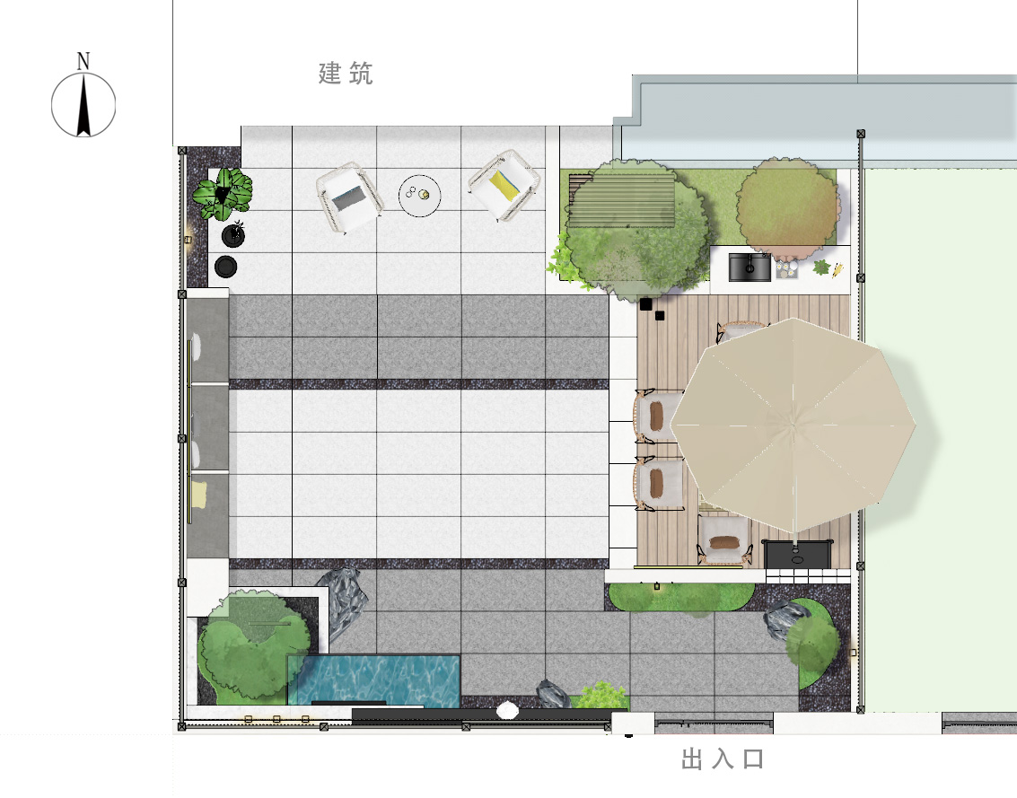 花园整体以黑白灰为基调色,整体空间设计为现代简约风格,以“少即是多”为核心理念,旨在将室内现代简约的风格延伸至户外,打造一个与室内相融合的延伸式生活空间。我们摒弃繁复的装饰与冗余的堆砌,专注于空间、形式与材质的本质表达。通过简洁的线条、材质以及光影变化,营造一个集休闲、社交、冥想与观赏于一体的高品质户外环境,让庭院成为居住者心灵的栖息地和生活的拓展厅。