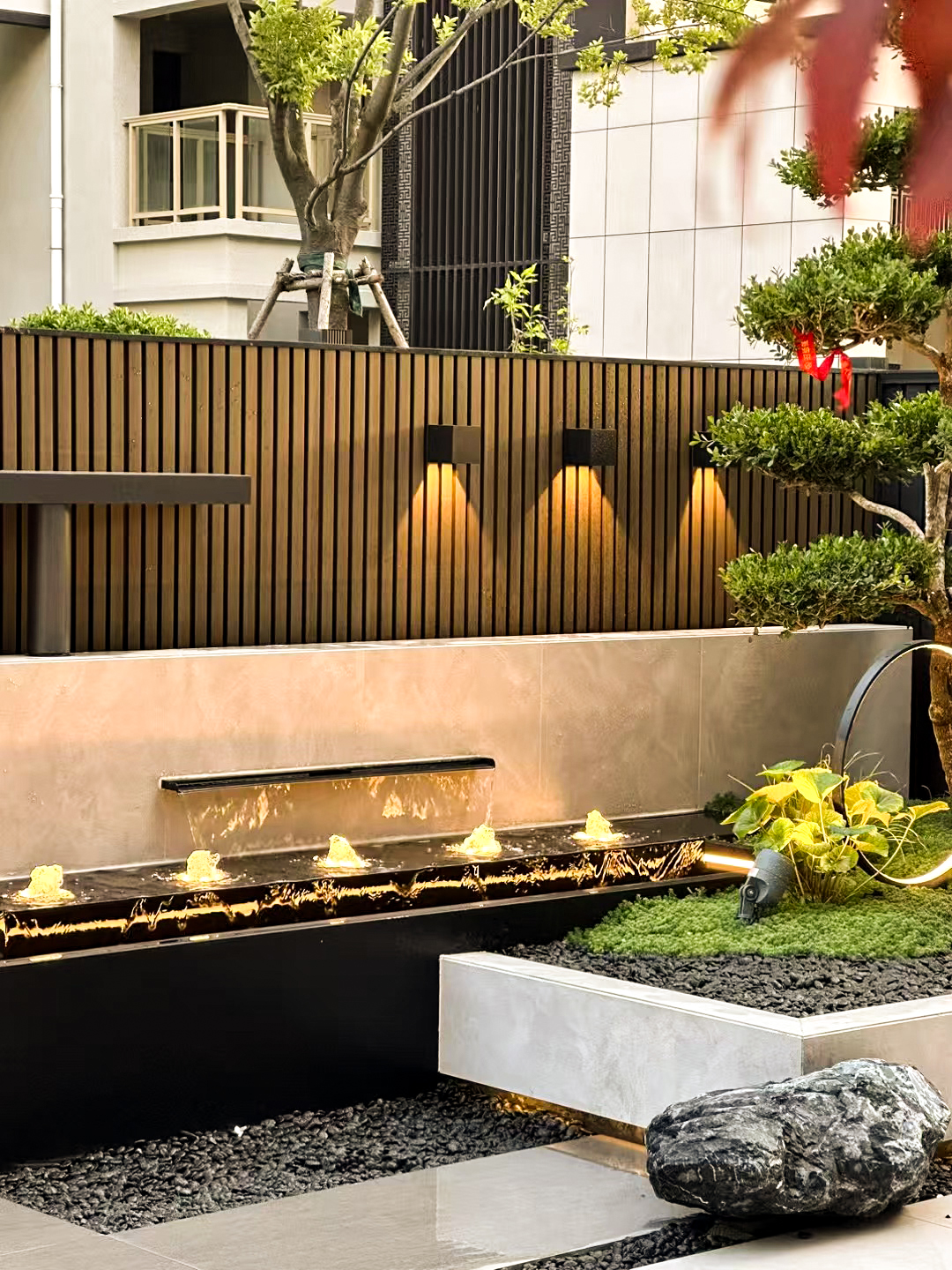室内出户根据原有高差,因地制宜,设计一个休闲平台,是室内向室外的过渡与延伸,庭院中间采用了现代简洁的奶白色与深灰色相间的石英砖作为大面积的地铺,点缀黑色小卵石,节省成本的同时增加趣味性;对景为低矮景墙、景观跌水结合观赏草搭配,右侧一棵造型黄杨作为主景树,姿态苍劲秀丽,搭配彩虹蕨、大叶吴风草、中华景天等,再辅以黑色小卵石、圆形灯、黑山石等装置,小院绿意随即精致活泛起来,景深通透间更显朴素淡雅,水景后景墙使用朦胧水墨画花纹石英砖作为景墙贴面,结合木色长城板,点缀壁灯,担当夜晚的氛围组,整个水景区四季常绿,富有诗情画意。