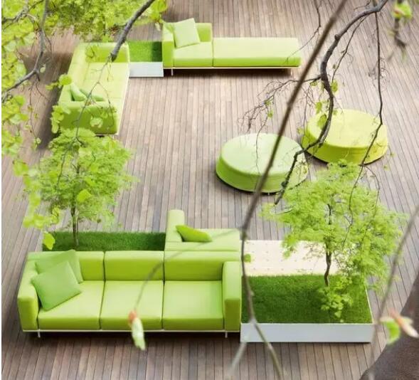 当木平台遇到树木,不需要习惯性的给树砌一个池子,它们有更好的结合方式,只需在木平台上给树留一个孔洞,让树从木头里“钻”出来,让它们一起生长。