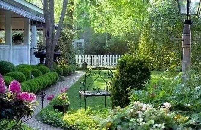 粉色系的玫瑰种植、白色系的铁艺家具、木质的凉亭、玫瑰花门、修剪整齐的绿篱都是此种风格的必备元素。