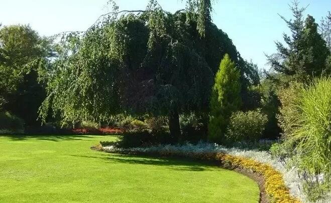 为了达到植物整体层次有一个很好的渐次过度的效果,高的植物高度不应高于整个植物群宽度的2/3,如果是岛状植物群,则不应该超过其宽度的1/2。