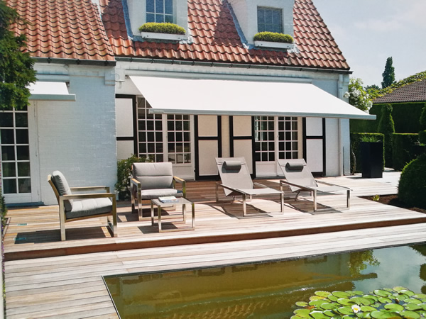 在图中青岛花园设计来看,木质地板如同巨轮上的甲板,大方气派,浅浅的水池座落在露台前方,池中睡莲静悄悄地生长蔓延,逐渐占据了水面,只不过水池规规矩矩的造型严格控制着睡莲的长势。设计者有意识地将水池和露台分割开来,使这里的空间关系変得十分明朗。摆放家具的区域是室外起居的地点,而下方的水池区则提供了户外生活的乐趣享受。