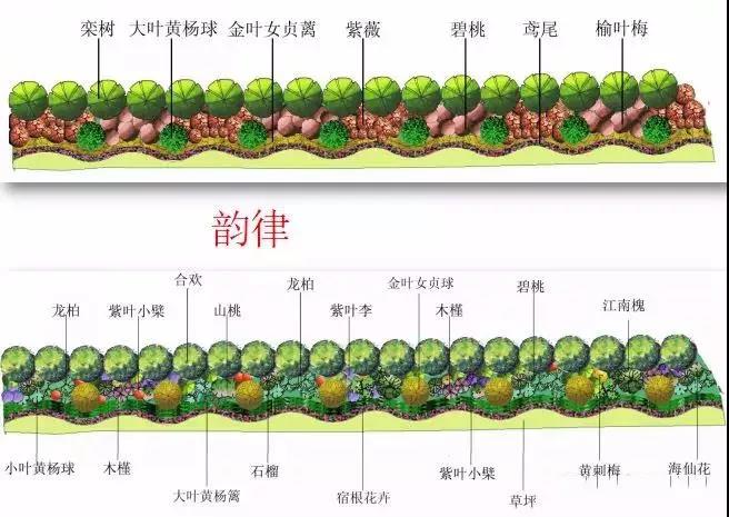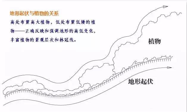 高处布置高大植物,低处布置低矮的植物——正确反映和强调地形的高低变化,丰富植物的景观层次和林冠线。