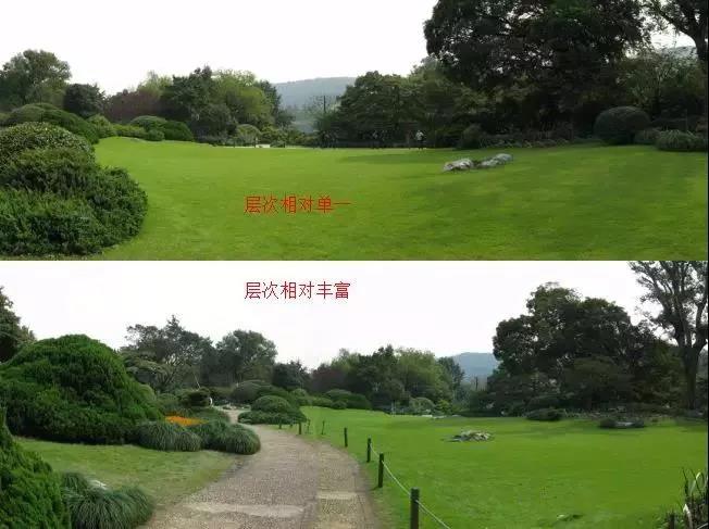 过多强调对比而缺乏调和的因素,导致园林布局杂乱无章;反之,过多强调调和而缺乏对比的因素,导致园林布局呆板单调。