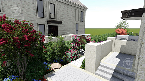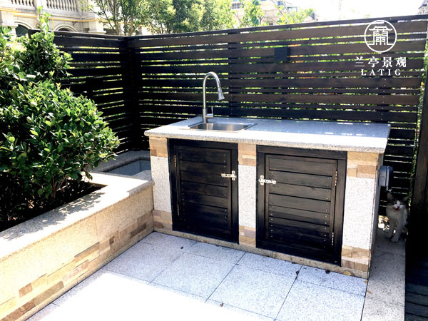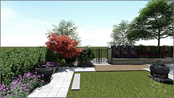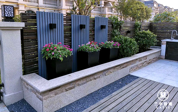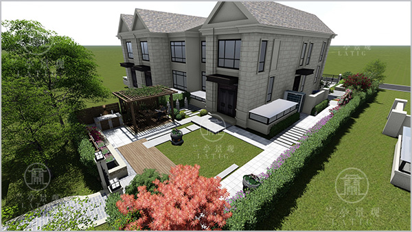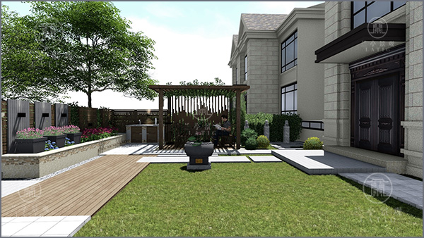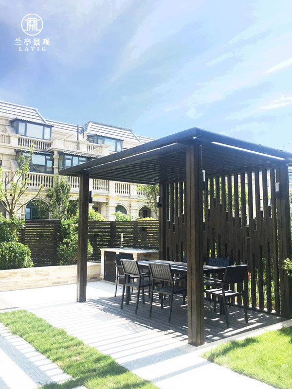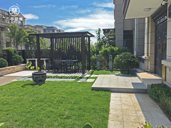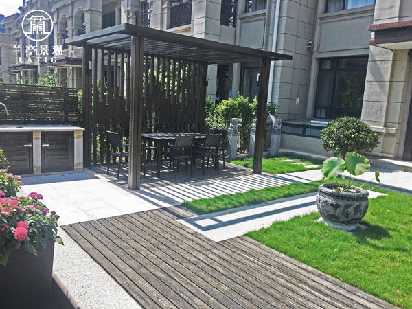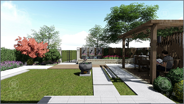 设计说明:整体设计上给人以清爽雅致之感,宽敞的布局让人更加舒适。廊架及木格栅以简约的造型为基础,加上中式的荷花青石缸摆件,空间层次更加丰富,大而不空、厚而不重,凸显庭院生活格调。