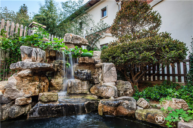 沿着自然的碎拼小路走到山边水边,倚栏观鱼游,池边听泉音,让人自然而然的放慢脚步,停下来享受此时此刻的美景。 假山不仅在园中起到了观赏的作用,又赋予了招财聚宝的寓意。假山旁边是一处凉亭,坐在亭中,满园美景尽收眼底,适合用来读书、喝茶、作画、聊天、独处。在自然驳岸水系周围,配合植物围合点缀营造意境,仿佛将大自然搬到了自家院子,闲暇时听枝头鸟鸣,赏鱼游水动,看绿叶婆娑,很是惬意。