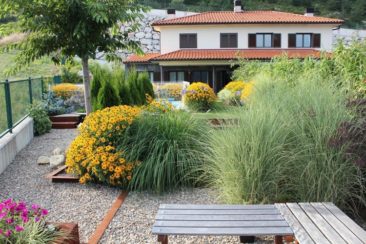 上面别墅景观庭院设计案例,整体显得要繁复一些,造价也会更高。主要以观赏草为主,色调也偏冷,如果你喜欢追求个性的话不妨尝试一下这种类似的设计方式。