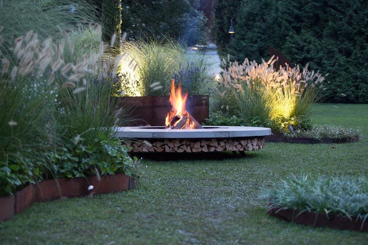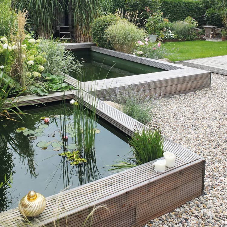 最后,这套青岛别墅景观庭院设计的几处水池晓得比较有趣,会让人误以为是用防腐木砌的水池。铺装区域也是大草坪和砾石搭配,植物以观赏草为主,自然搭配,显得颇有野趣。