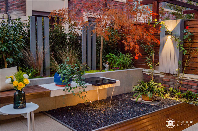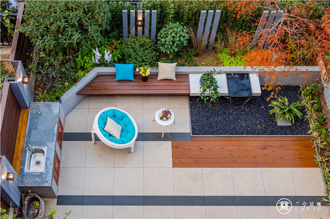 整个花园地面材质注重简约干净,跳色镶嵌芝麻黑让地面铺装更有律动感;同时,临近水景,材质中融入木制元素,既柔化石材带给人们的硬朗,又呼应立面的木制景观,给花园主人良好的花园体验和独特的视觉感官。