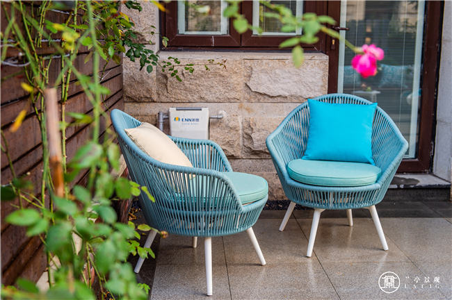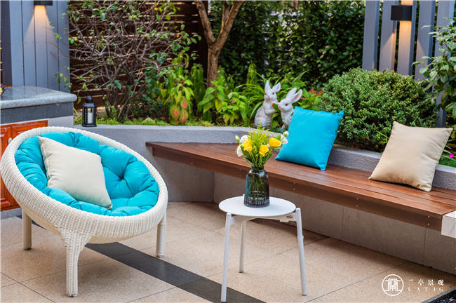 值得一提的是,小小花园里竟有两个休闲空间。其一,拓宽出户平台,置两把户外座椅,使之成为一个小的休闲空间,建筑上的挑檐恰是天然的户外雨棚。晴天时,看书、养花、晒太阳,尽享午后闲适时光;雨天时,喝茶赏景好心情,雨中景色别样美!