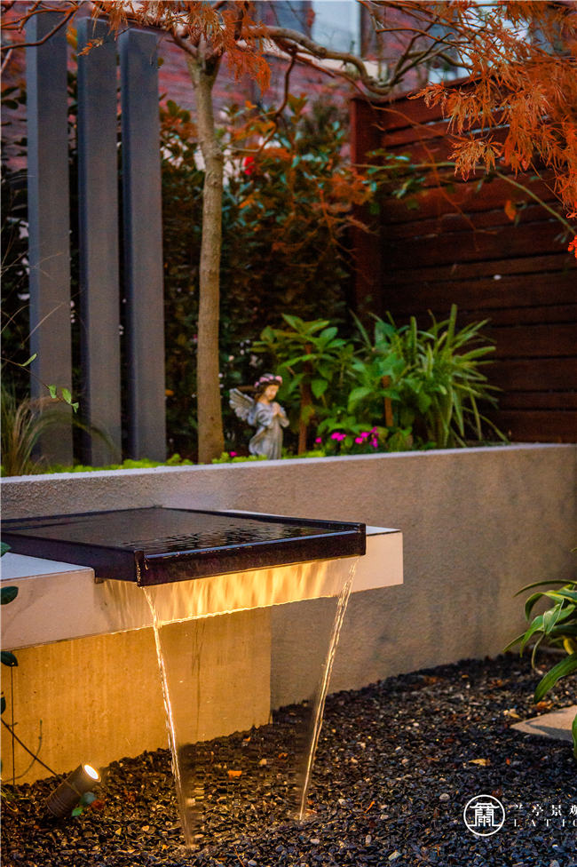 纵观整个北花园,其空间功能相互咬合衔接,既是景观空间,又是活动休闲空间。推开门,摇曳的羽毛枫下,小天使静静的站在花丛中,伴随着悦耳的流水声,这美好的画卷映入眼帘。