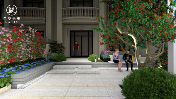 解决方案:出户对景墙选用一路繁花相送的寓意,为客户打开花园的门厅。两侧的微地形景观疏朗有致,搭配上花盆软装,轻奢有质感。