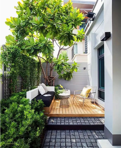 二、小庭院设计的铺装花样多起来,小型庭院铺装尽量丰富,用一些看得见或者看不见的视觉暗示,来无形中增加空间的节奏感,这样不会一览到底显得无趣,让多个“点”来组成一个不冲突的整体;