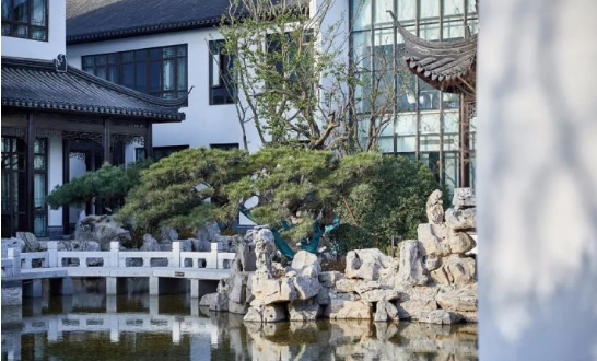 在这个清新淡雅的新中式庭院里就遵循了中国园林讲究的“舒处之去由,察水之来历”,谨遵“虽由人作,宛若天开”的法则:水系无论大小,必曲折有致。将江南园林“聚则通阔,散则萦回”演绎的淋漓尽致。