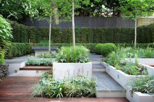 第三步通过防腐木地台与地砖铺设通过台阶式设计,用小叶黄杨与鹅软石弱化边缘的生硬感,功能划分一目了然,整体简洁耐看,细节打造可见用心;台阶与花池一起打造,用材上也一致 选用白水泥饰面,地面浅灰砖铺设,清一色的绿植 高低错落,色调统一,样式简单但有变化,以景观为主的院子这样打造再好不过。用白色水泥花池做出高低层次,绿植也是用高、中、低搭配,再加上地面铺装中点缀的绿植,这不是构成里的有序中的无序吗?