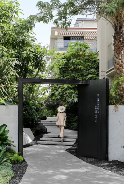 还有一种是开放式庭院门,通过适当留白,采用矮墙或玄关等巧妙应用,使花园整体设计更具符合我们房屋的外观,进一步渲染场景气氛的对比效果。