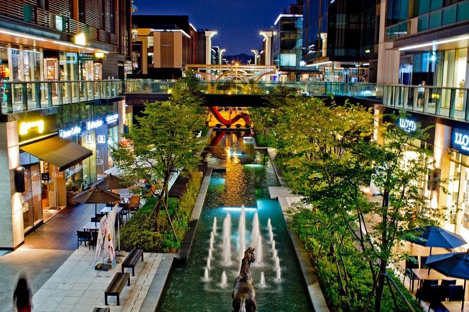 仁川松岛NC CUBE CANAL WALK 购物中心有许多相互连接的建筑物,它们之间是一个喷泉,就像一条小运河。这不仅是购物场所,也是散步场所,更是韩剧热门拍摄地。