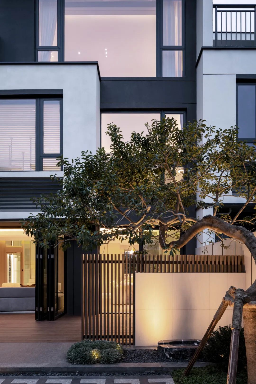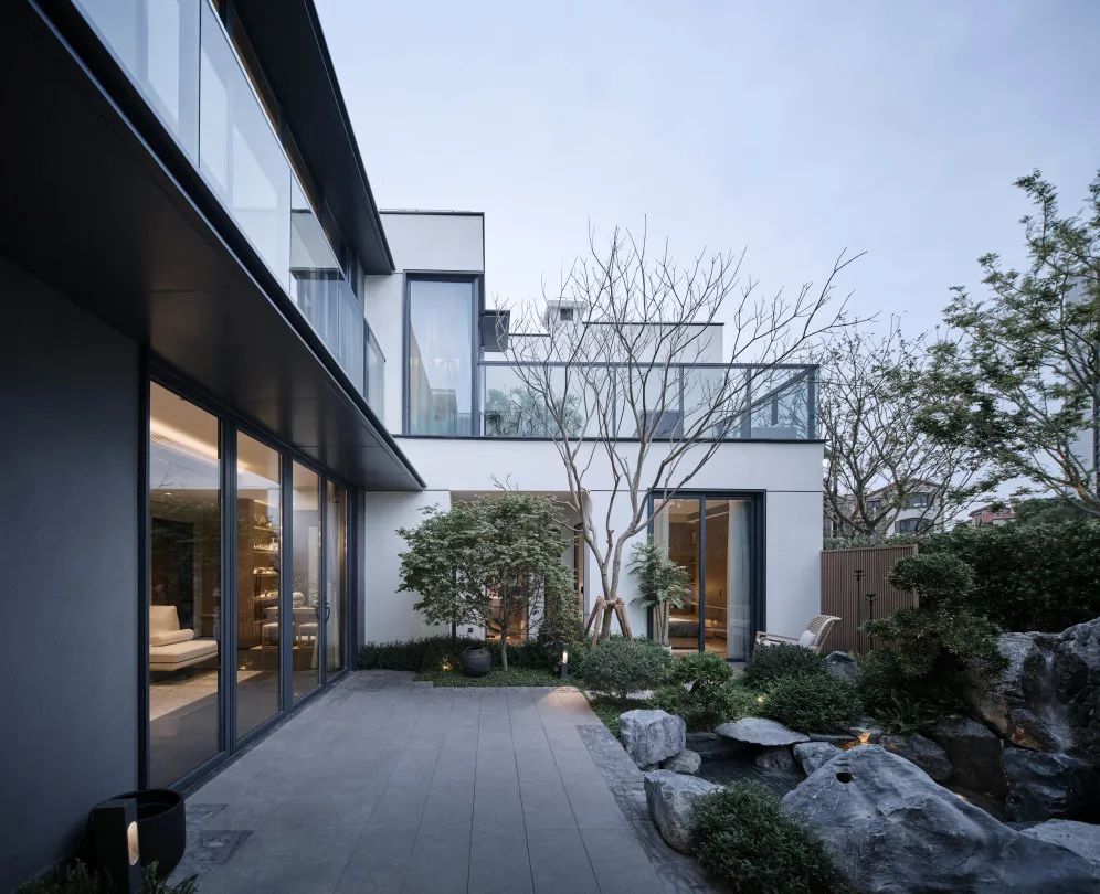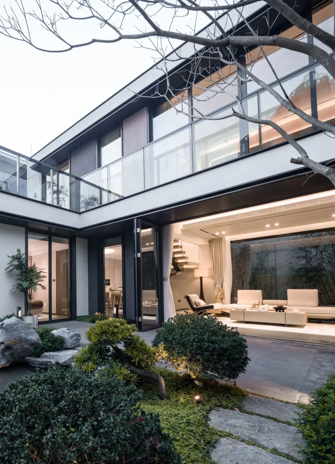 建筑立面的黑白之间尽显中式水墨的风雅,凝练的线条将现代建筑与传统国风相融合。日照别墅花园设计