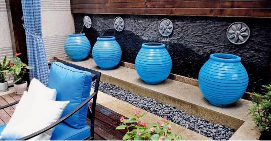 水景墙配合蓝色的主题,4个翠蓝色大陶罐置于墙体前方显得尤为突出,与木质平台上的整套铁艺椅形成完美的呼应。烟台别墅庭院设计