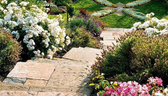此方案园路阶梯设计的甚为巧妙,用厚厚天然石板铺设,两边用石头累成不同层次的阶梯平台,形成一个独特而自然的坡地景观。