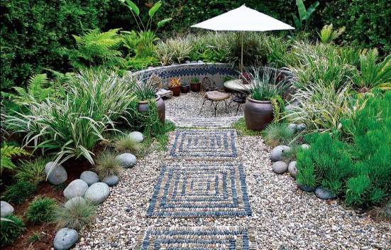 利用零散的石料做出的弧形纹样,给空间增加了很多神秘感和趣味性,在石块排列的部分,可以只堆放石子,还可以散铺玻璃球、贝壳、糖果等让人意想不到的装饰物,会让庭院更加艺术生动。烟台花园设计
