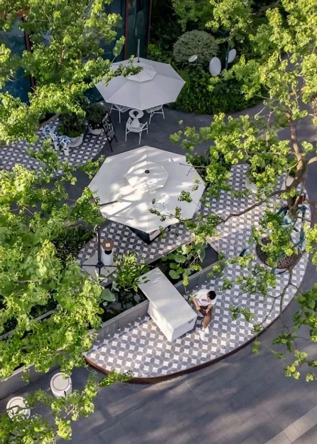 整个设计以草地或砾石为主,保留自然美感。使用木质家具或铁艺家具,增加自然的氛围,同时提升舒适度。可以选择户外木的树池卡座,橄榄树、金合欢、棕榈树、鸟蕉等作为主要绿化,增添度假放松的美感。青岛庭院设计