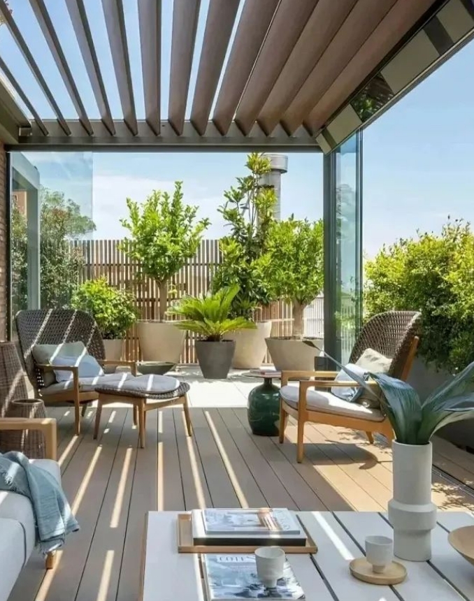 通过大面积的玻璃窗将室内与室外的自然景观紧密结合,冬季考虑气温低不适合户外活动时,可以在花园里规划一个阳光房,既可以享受温暖的阳光同时也可以欣赏冬季花园的美感,增加户外活动的空间。青岛别墅庭院设计